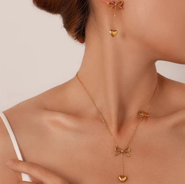 This elegant Heart Drop Two Bow Charm Pendant Necklace is the perfect accessory for any outfit. Crafted with careful attention to detail, it features a delicate heart-shaped drop adorned with two charming bows. Its timeless design adds a touch of sophistication to any look, making it a must-have for your jewelry collection.